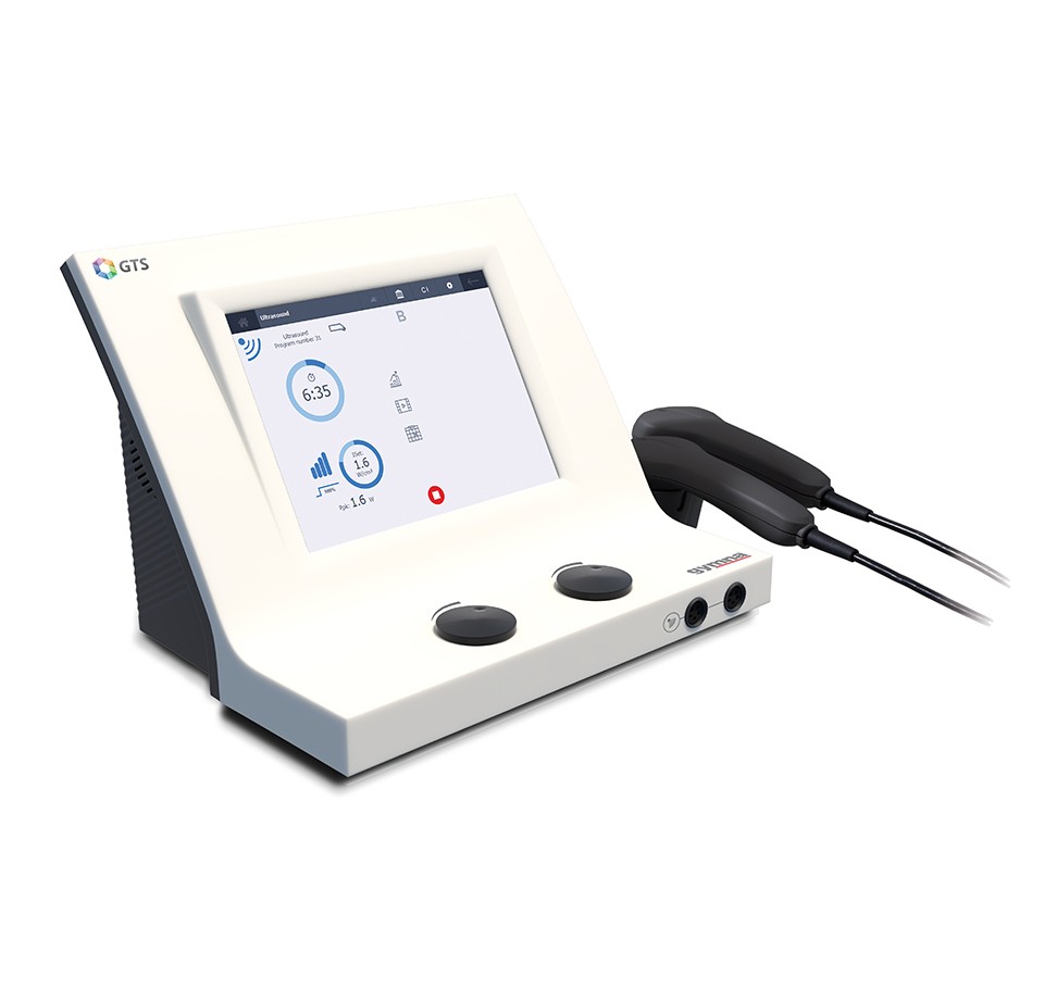 The Pulson 400, touchscreen device for ultrasound applications. Equipped with multifrequency ultrasound heads for superficial and deeper lying pathologies. Both ultrasound heads with 1cm² and 4 cm² are standard accessories. The color touchscreen, for intuitive navigation, guides you to optimal treatment protocols and access to extended clinical information with GTS.